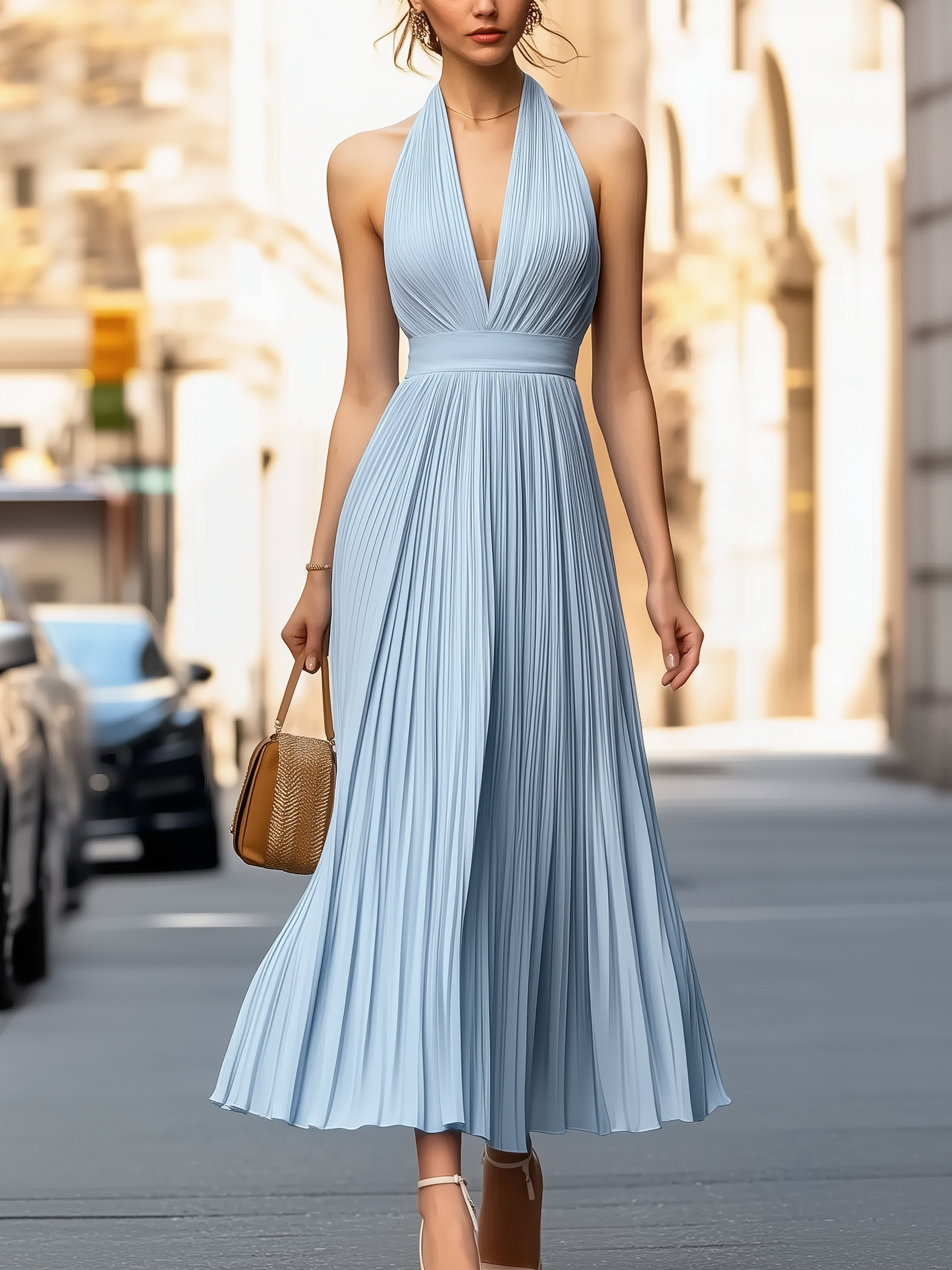 The Vavogue Elegant Halter Neckline Light Blue Pleated Chiffon Dress is designed to offer both comfort and style. The soft, lightweight chiffon fabric flows beautifully, creating a flattering silhouette. Featuring a delicate design, this dress exudes timeless femininity. Whether worn for daytime outings or evening events, it adds a touch of sophistication to any occasion.