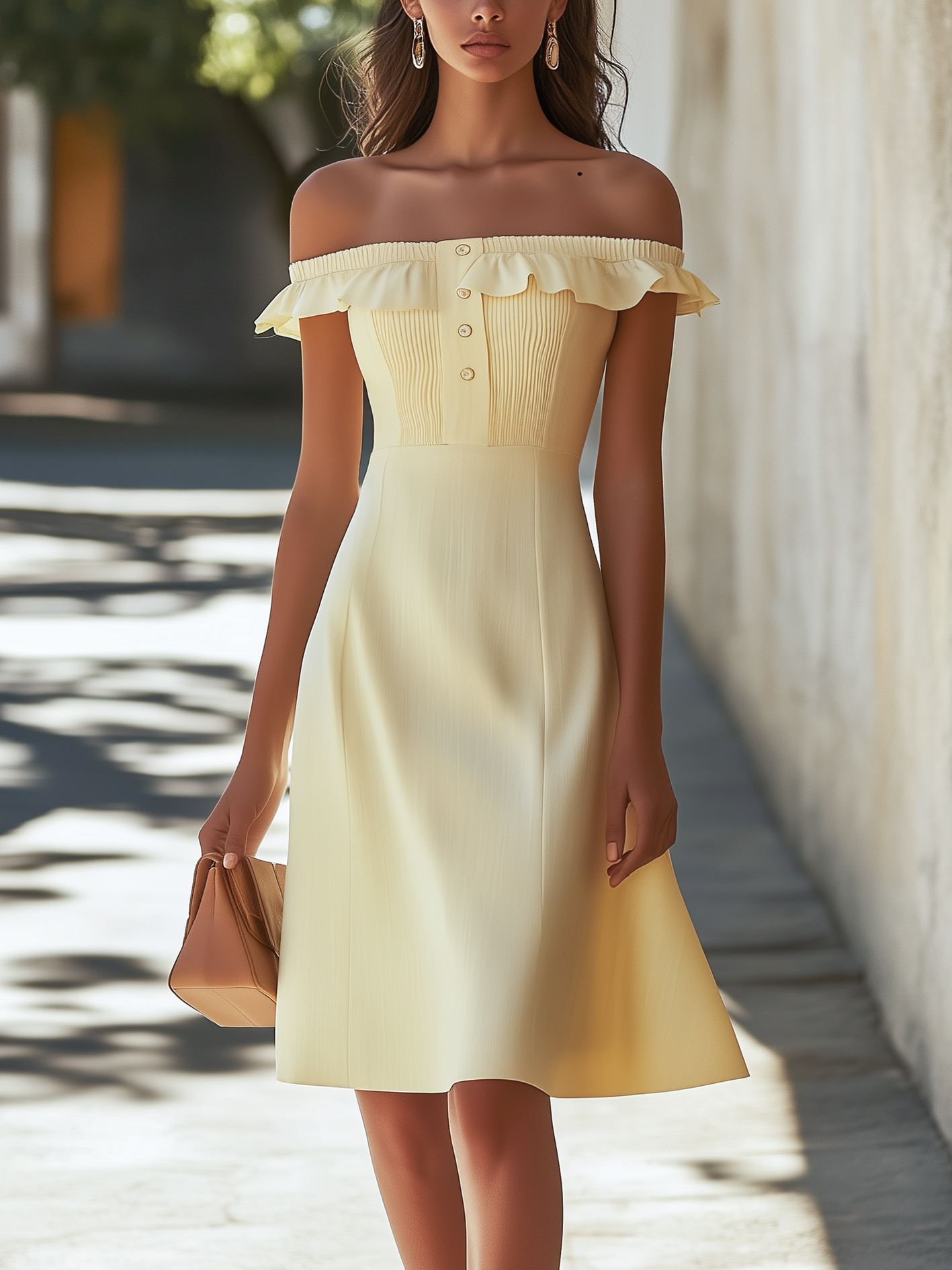 - Design: Off-shoulder, ruffle dtetail, pleated detail.