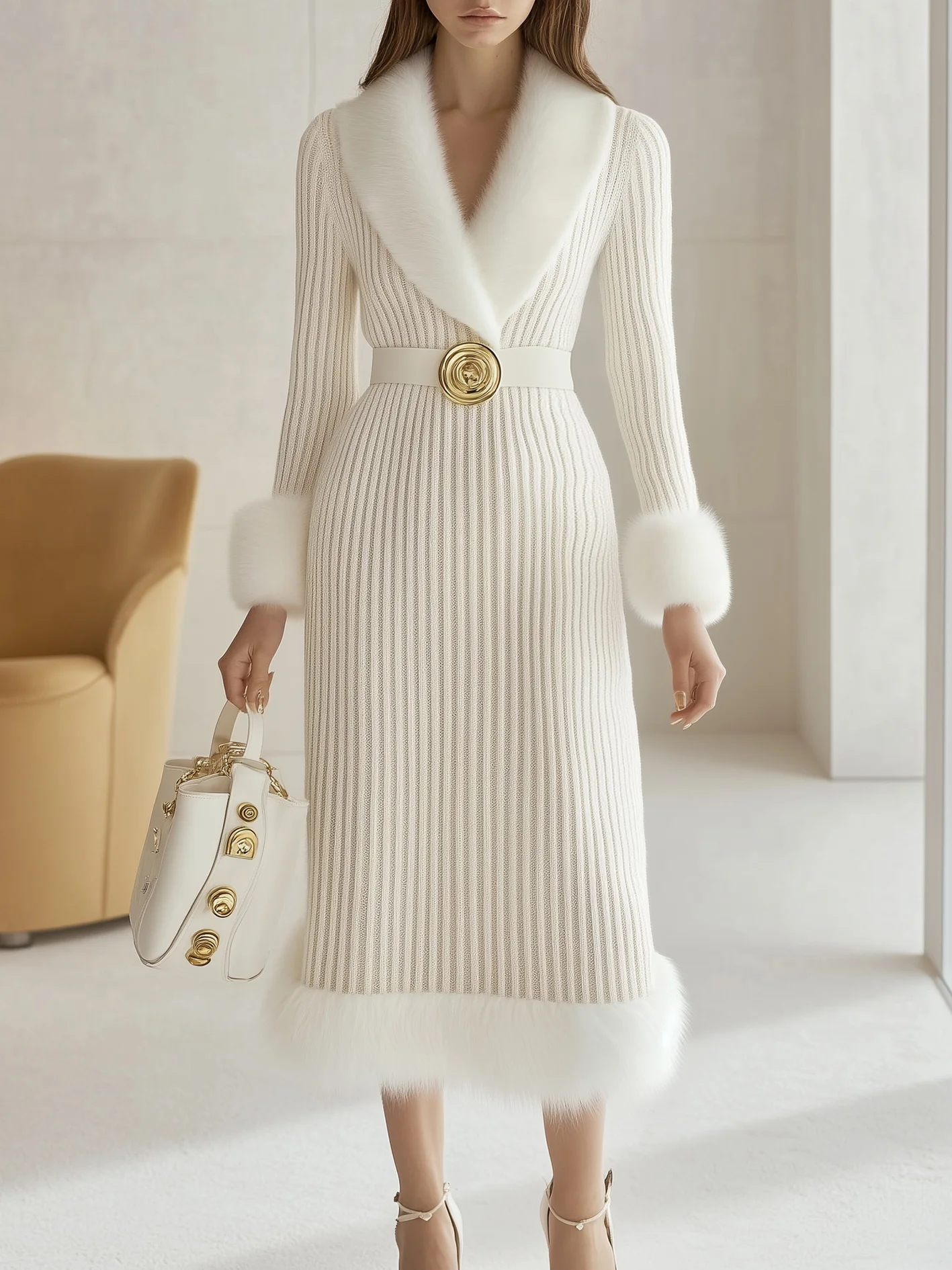 【24-HOUR SHIPPING】White Elegant V-Neck Fur-Collar Knit Party Midi Dress With Belt