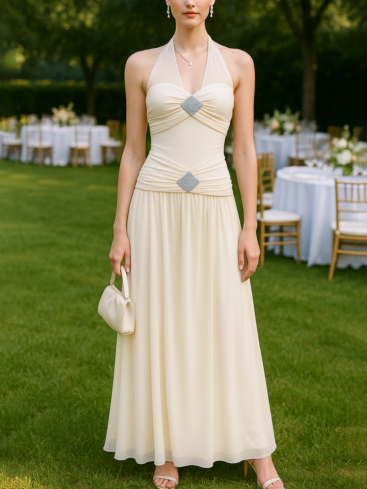 Elegant Silver Embellishment Ruched Detail Halter Neck Cream White Maxi Dress