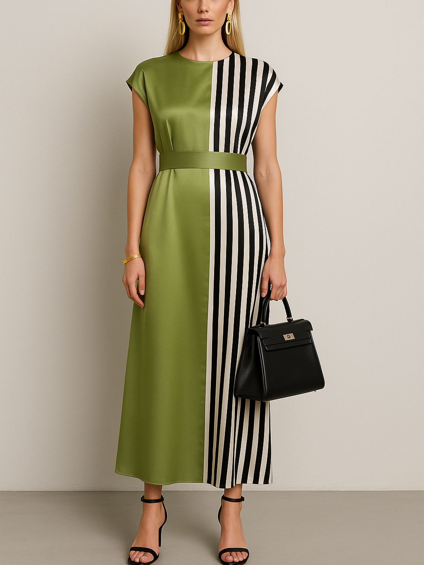 Classic Green Color Block Satin Silk Asymmetric Midi Dress