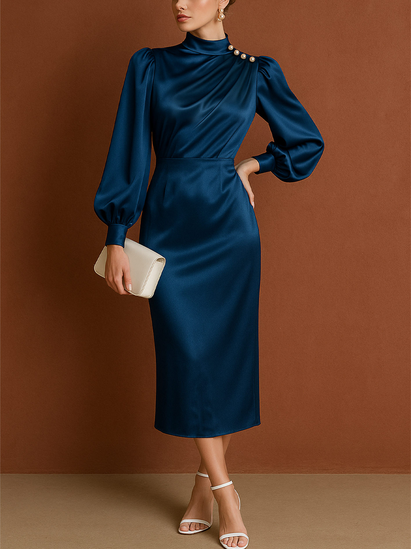 - Styling Suggestions:Pair this elegant midi dress with a pair of nude or metallic heels for a chic look. Add a clutch in a complementary color, and simple stud earrings to allow the dress to be the statement piece. For cooler evenings, consider a tailored blazer or a soft shawl draped over the shoulders.