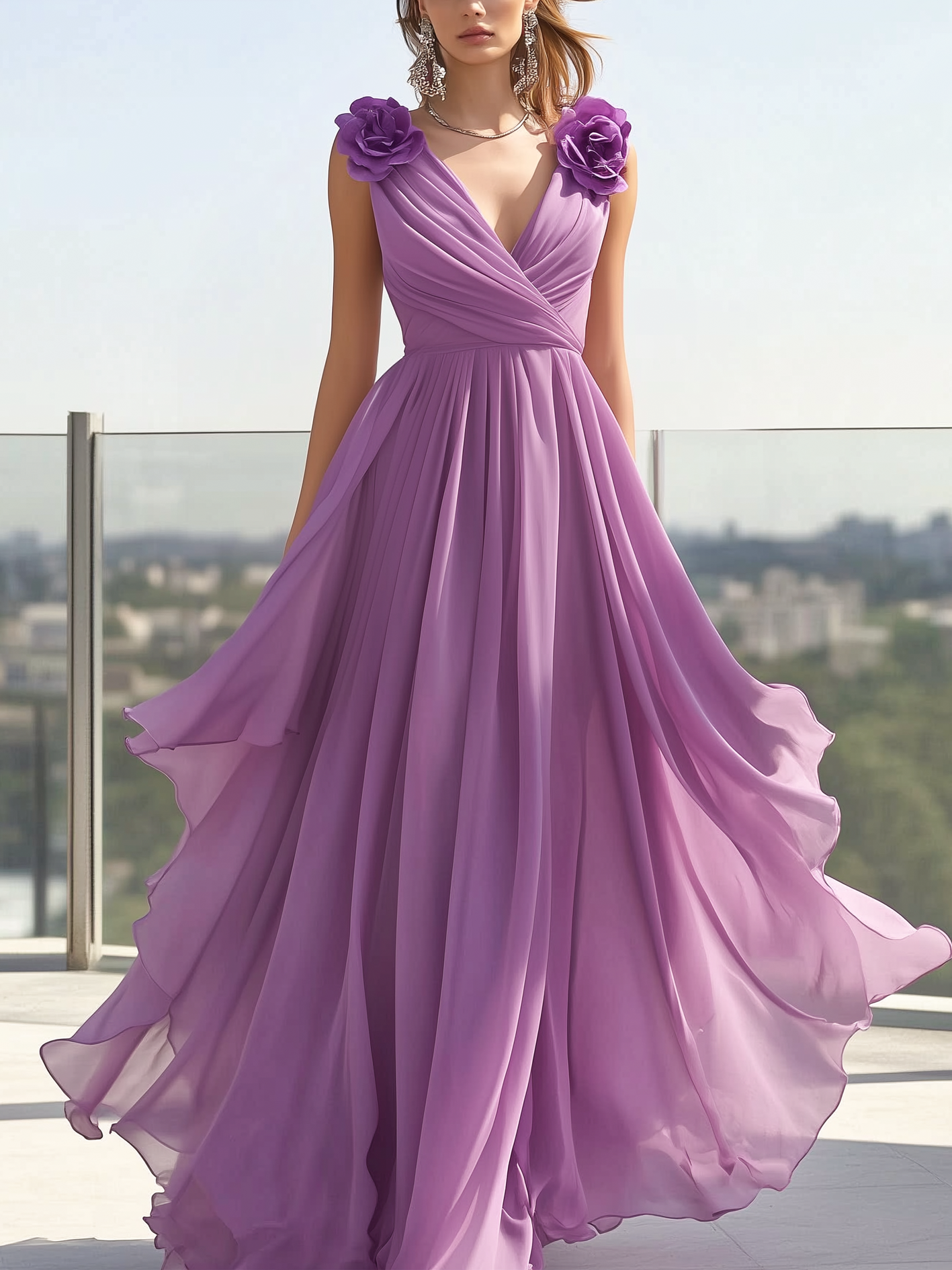 Elegant 3D Flower Detail V-Neck Light Purple Chiffon Maxi Dress