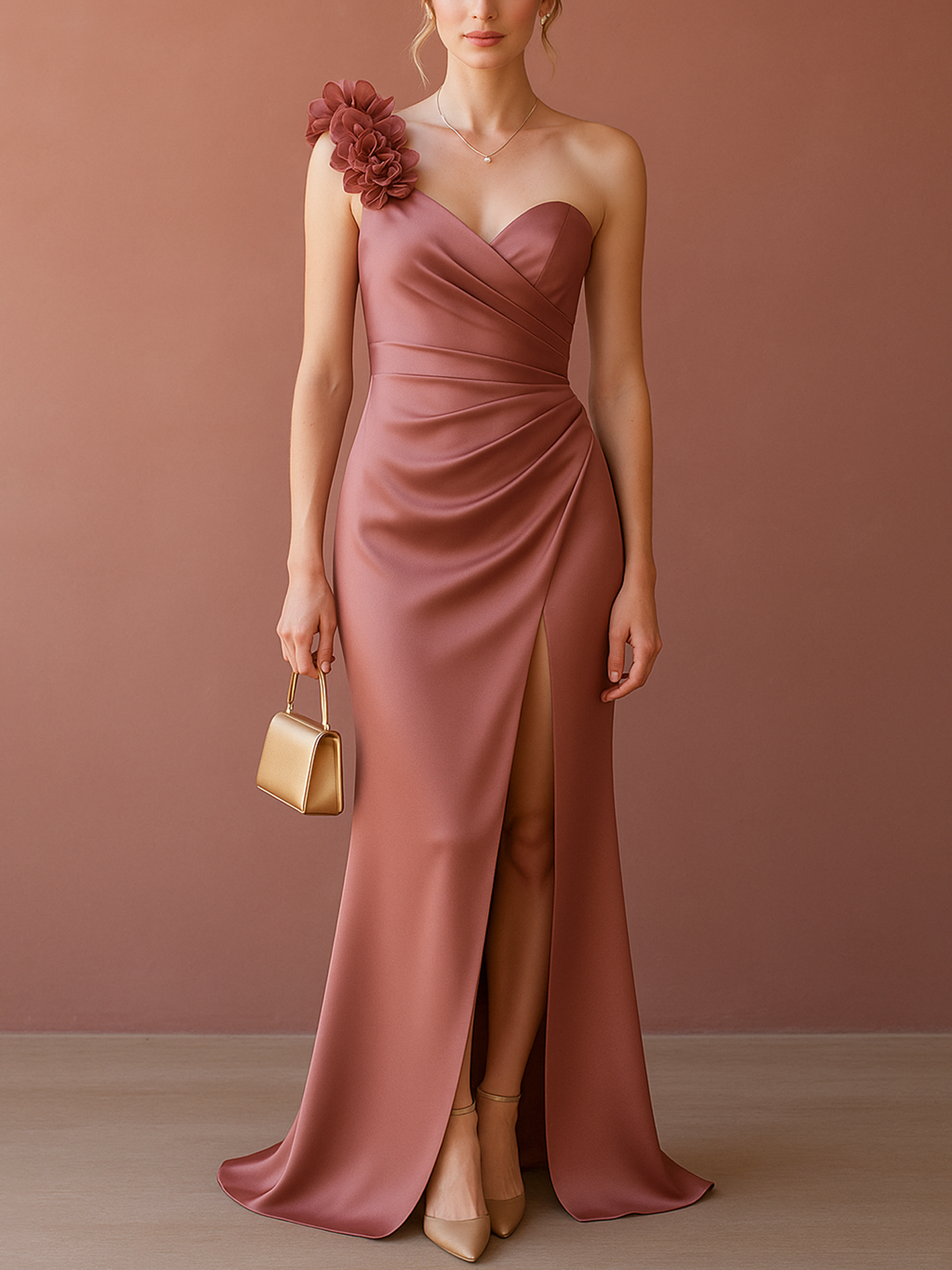 The Vavogue Elegant 3D Flower One-Shoulder Ruched Design Maxi Pink Acetate Satin Dress exudes elegance with its premium fabric and sophisticated design. The smooth material is adorned with delicate design, offering a perfect blend of romance and femininity. Whether you're attending a cocktail party or a wedding, this dress is an essential addition to any stylish woman's wardrobe.