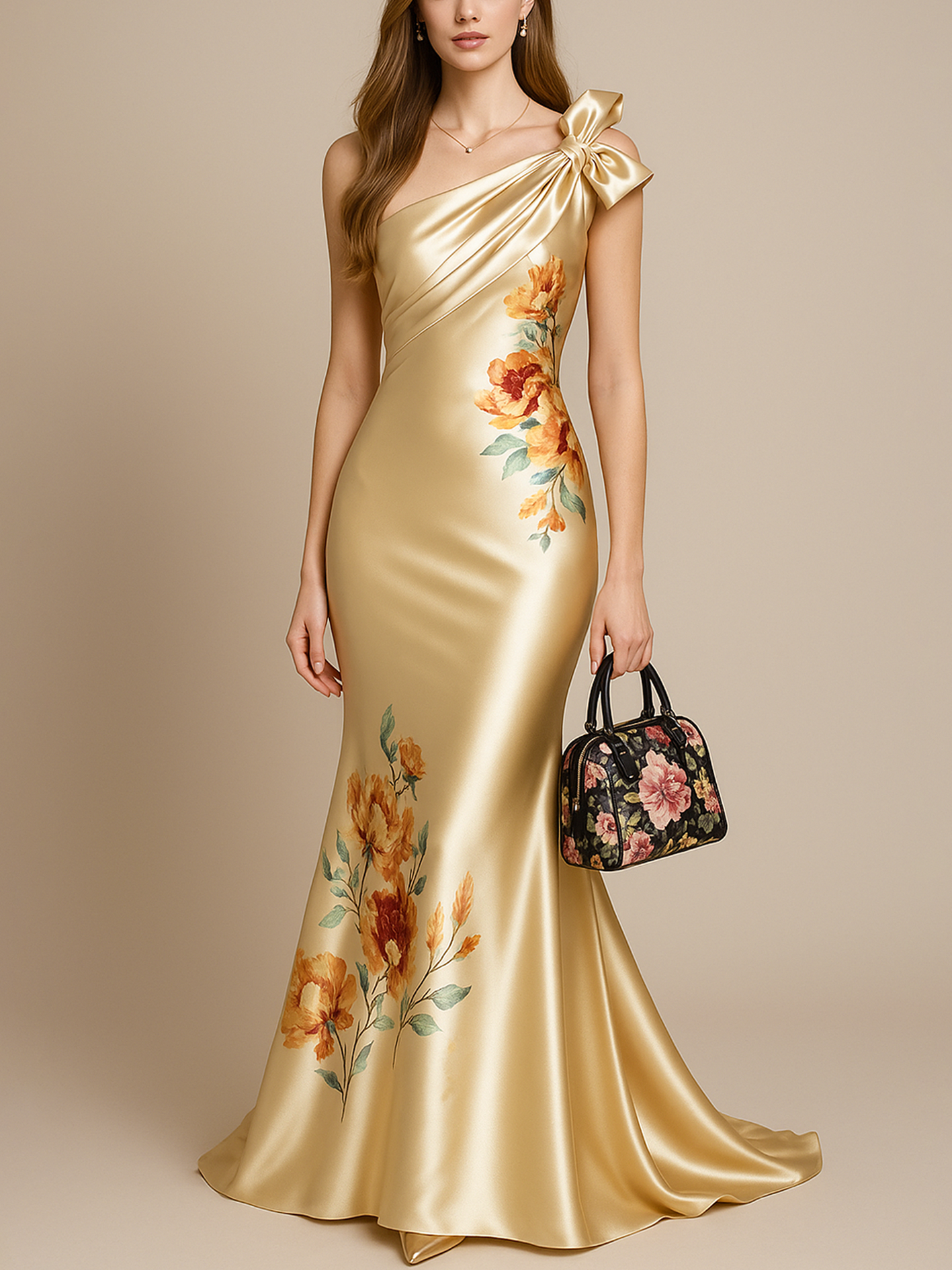Elegant Bow One-Shoulder Floral Print Maxi Champagne Gold Silk Dress