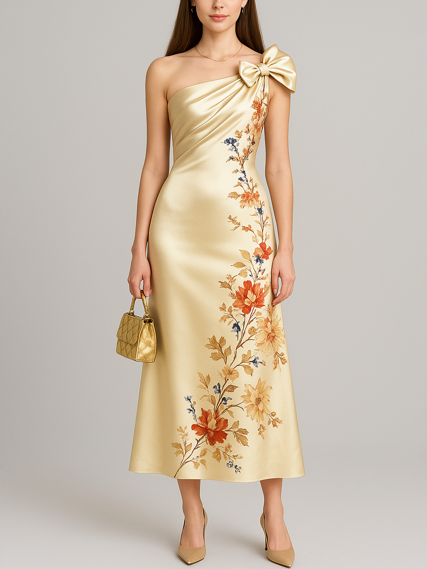 Elegant Bow One-Shoulder Floral Print Midi Champagne Gold Acetate Satin Dress