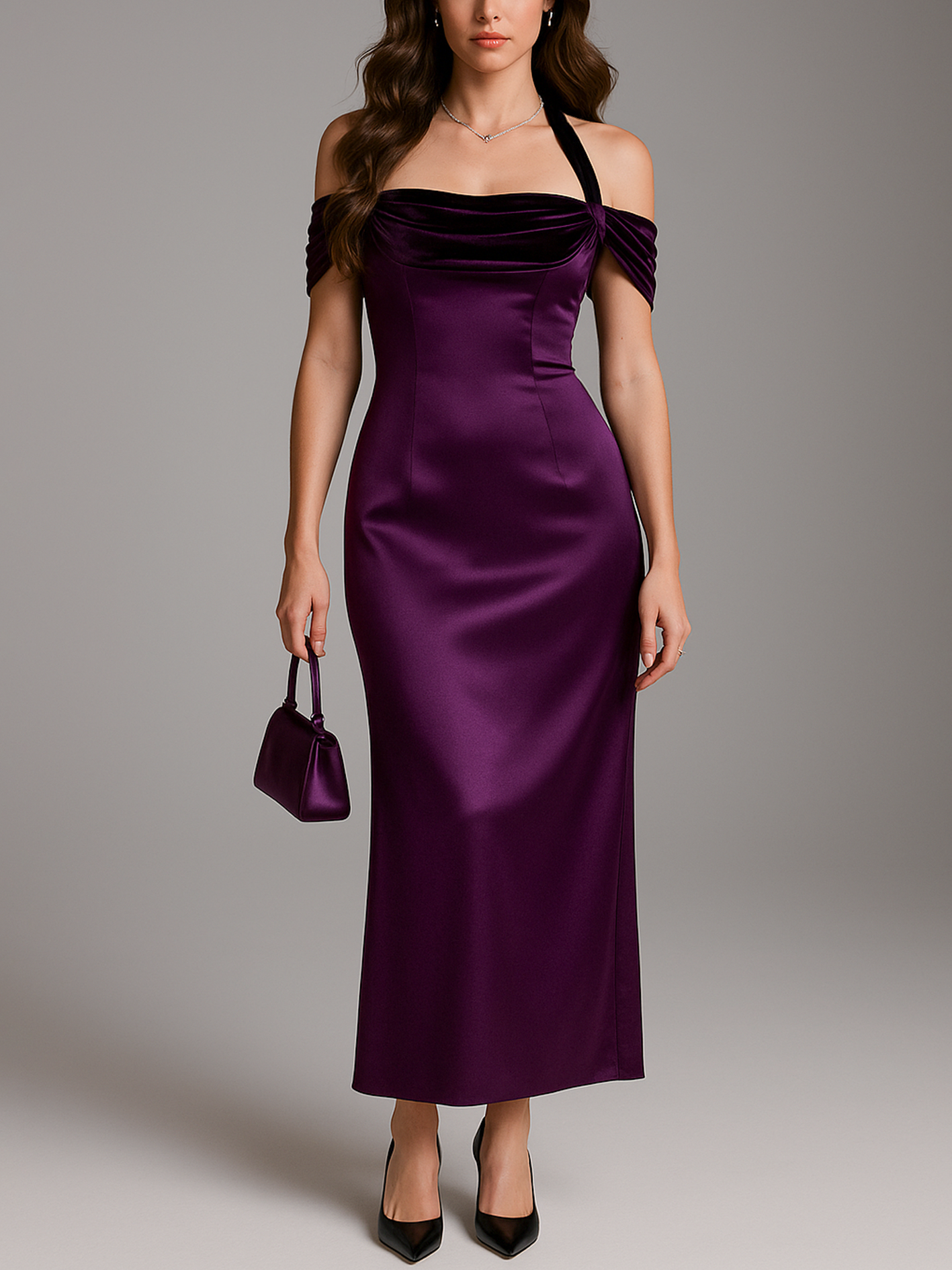 Elegant Halter Neckline Velvet Patchwork Maxi Dark Purple Silk Satin Dress