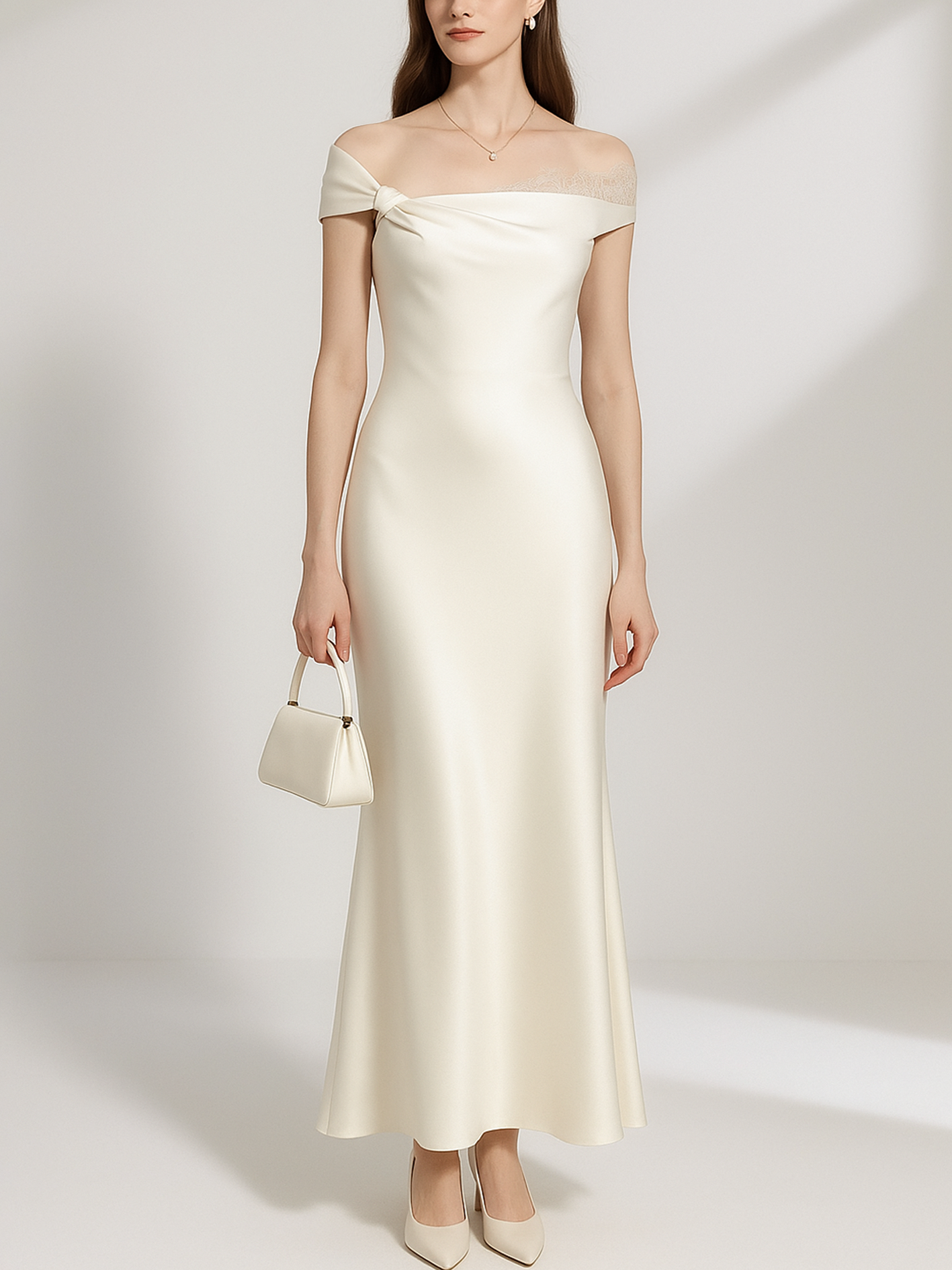 Elegant Lace Detail Off-Shoulder Maxi Cream White Acetate Dress