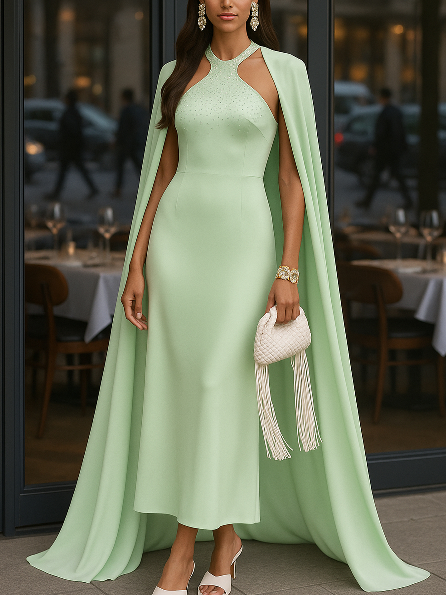 The Vavogue Elegant Light Green Satin Maxi Dress with Rhinestone Neckline is a statement piece that is both refined and striking. Its sophisticated design, quality fabric, and subtle sparkle create an ensemble that exudes poise and elegance. Ideal for anyone looking to make a memorable impression, this dress will be a cherished addition to your wardrobe.