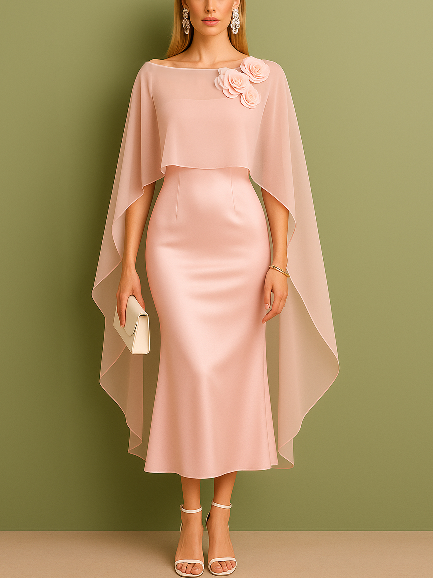 Elegant Light Pink Satin Silk Midi Fishtail Dress With Detachable Cape Style Overlay - Two Piece Style