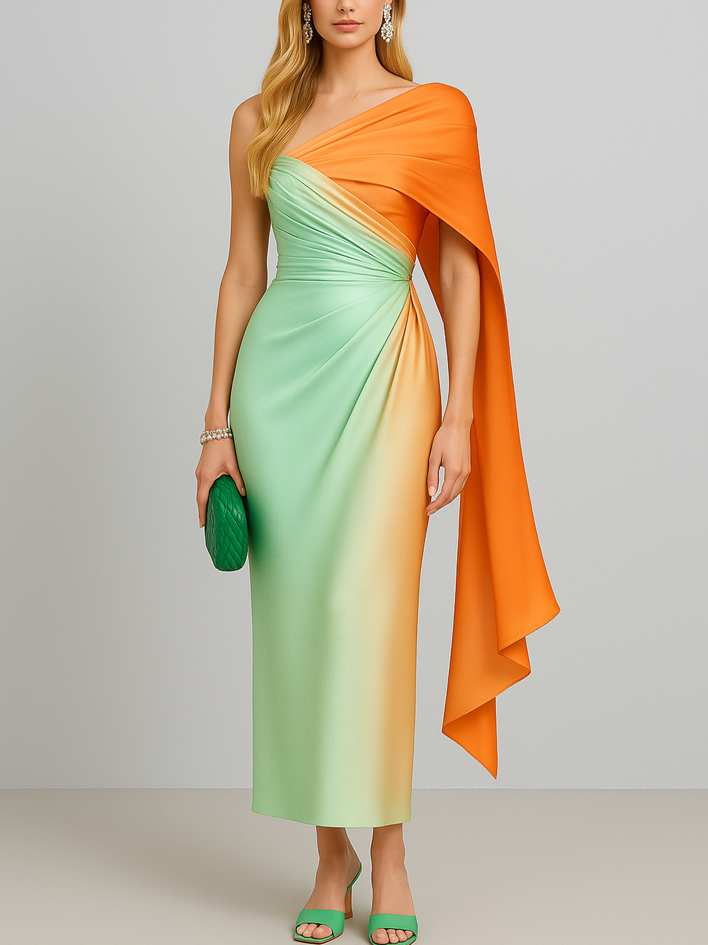 Elegant Ombre Silk Satin Asymmetric Pleats Midi Dress With One-Shoulder Cape Detail