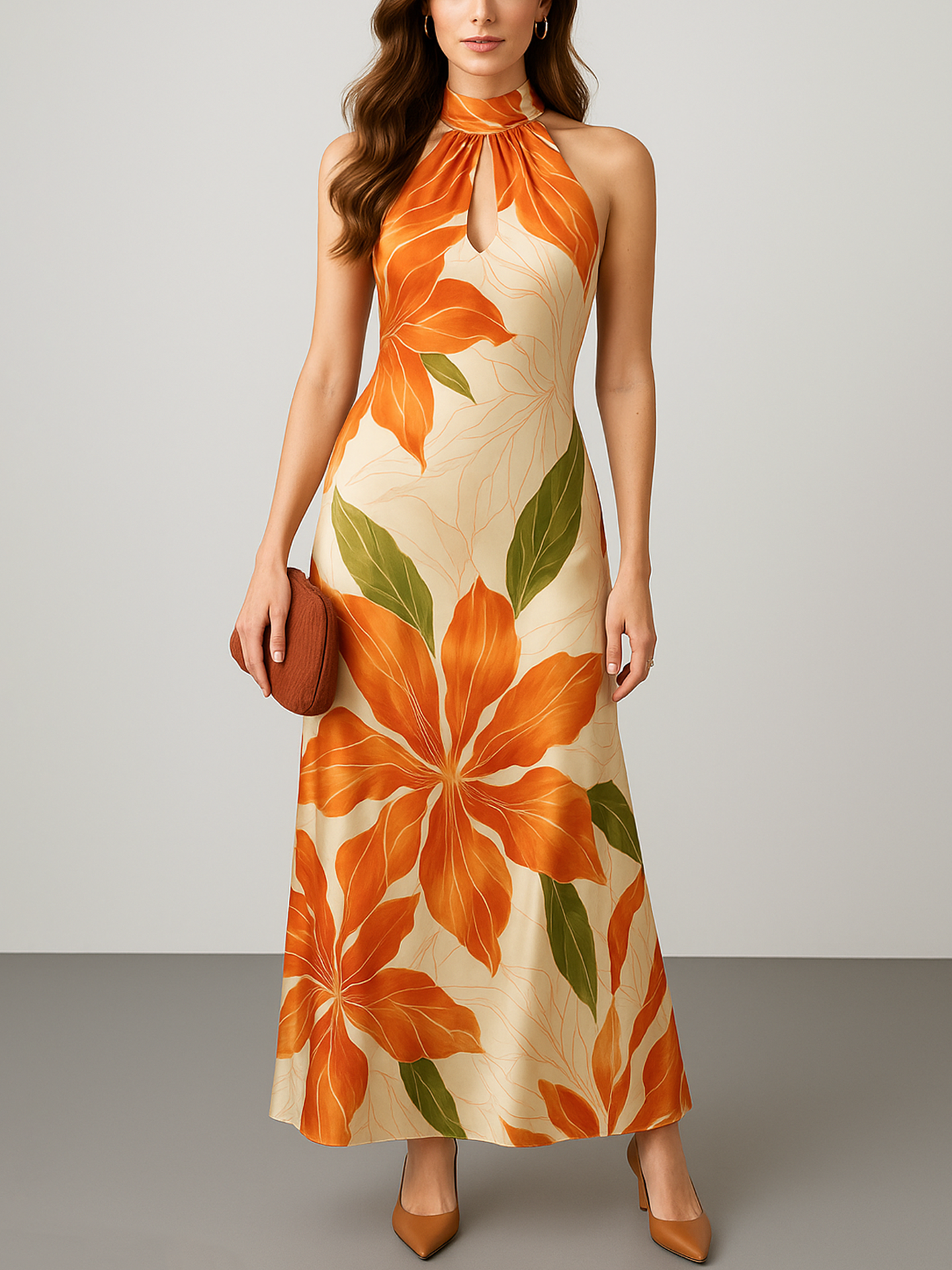 Elegant Orange Floral Print Halter Neckline Maxi Silk Satin Dress