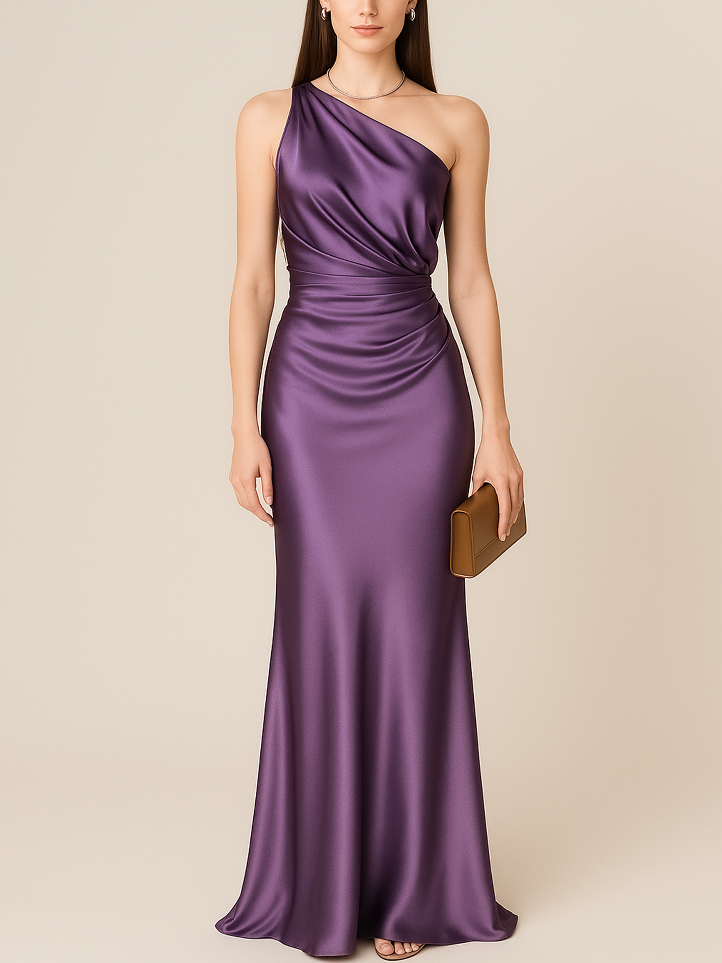 Elegant Ruched Detail One-Shoulder Maxi Purple Acetate Dress