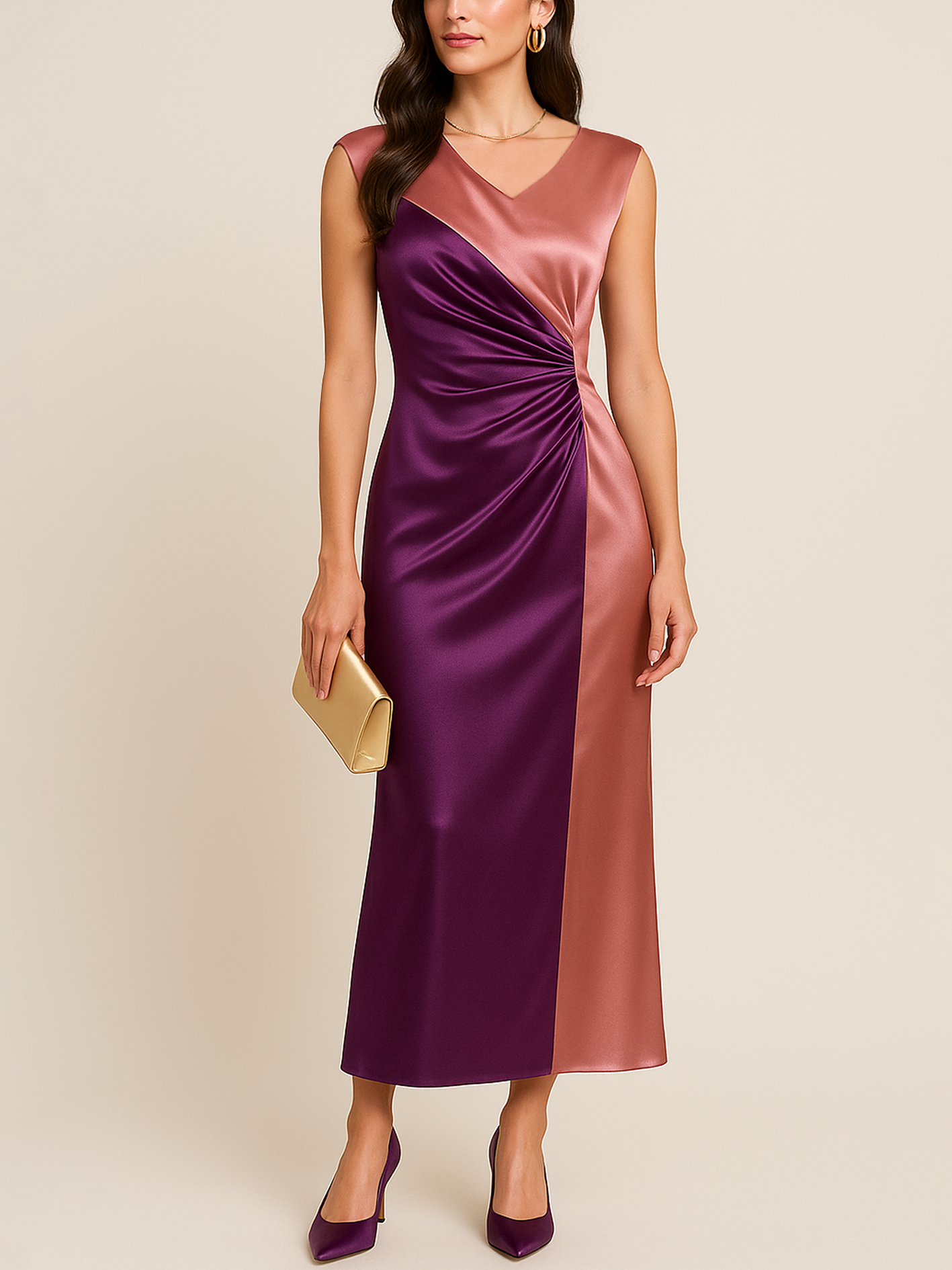 Elegant Ruched Detail Purple-Pink Color-Block V-Neck Midi Silk Satin Dress