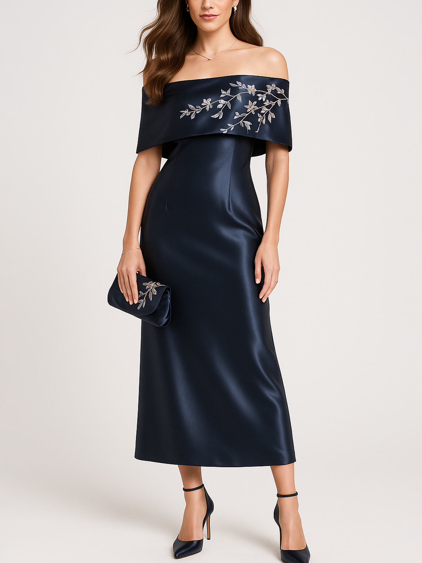 Elegant Silver Embroidery Detail Off-Shoulder Midi Navy Blue Silk Satin Dress