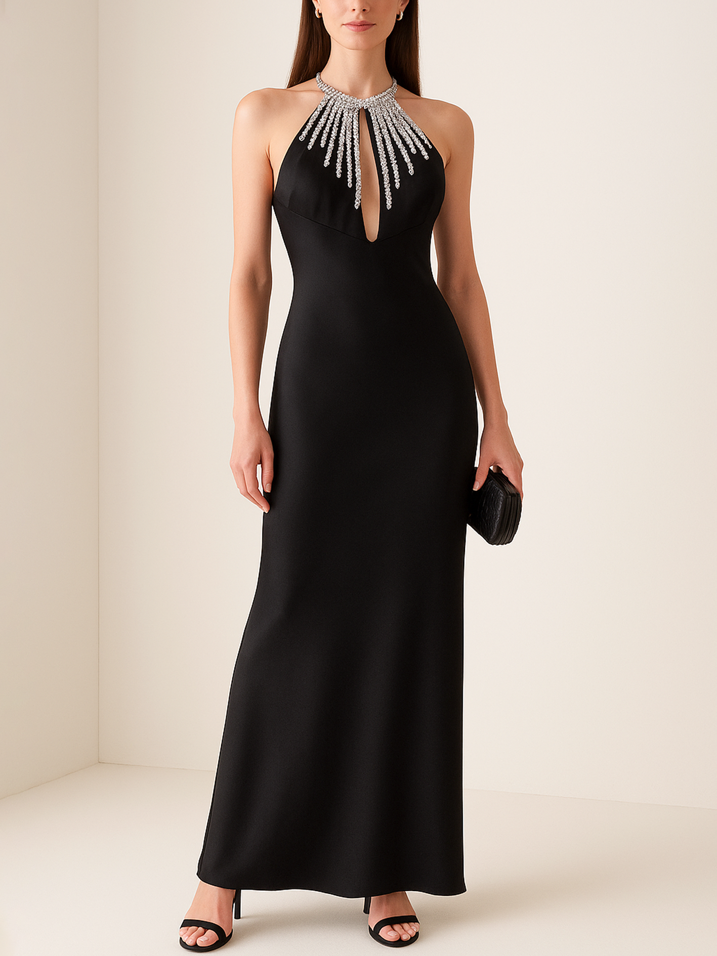 Elegant Silver Rhinestone Halter Neckline Maxi Black Acetate Satin Dress