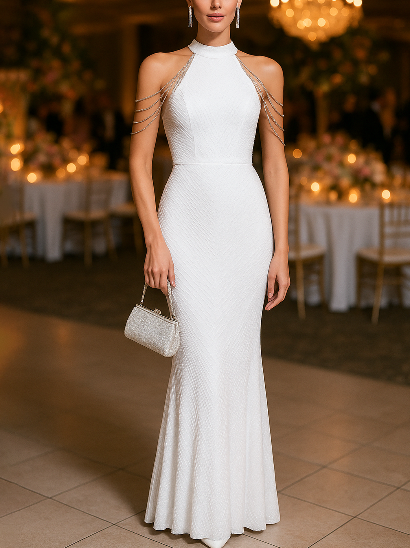 Elegant Silver Straps Detail Halter Neckline White Maxi Dress