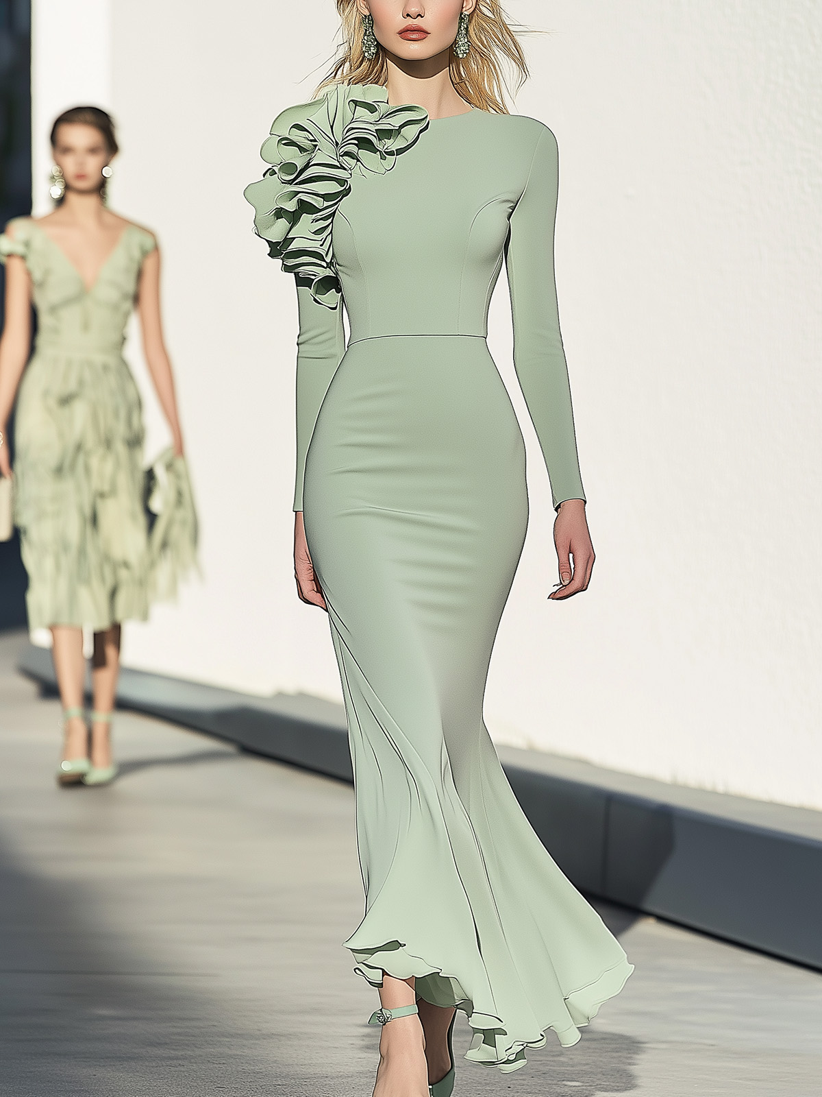 - Design: A sophisticated mint green dress featuring a sleek silhouette with a statement shoulder detail that adds drama and refinement