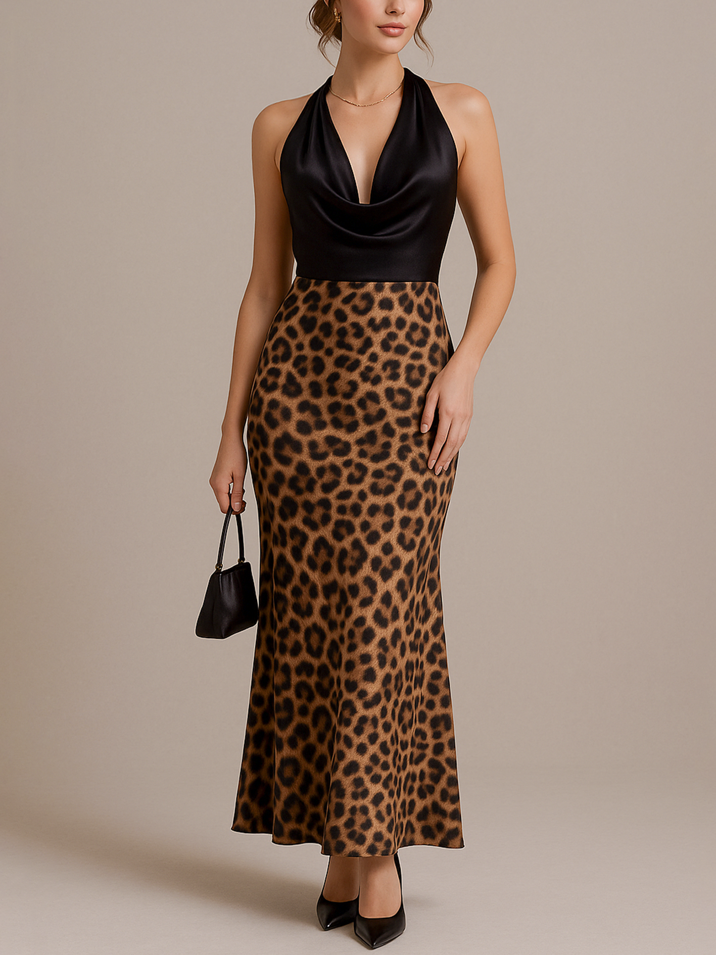 The Vavogue Stylish Elegant Leopard Patchwork Halter Cowl Collar Maxi Silk Satin Dress exudes elegance with its premium fabric and sophisticated design. The smooth material is adorned with delicate design, offering a perfect blend of romance and femininity. Whether you're attending a cocktail party or a wedding, this dress is an essential addition to any stylish woman's wardrobe.