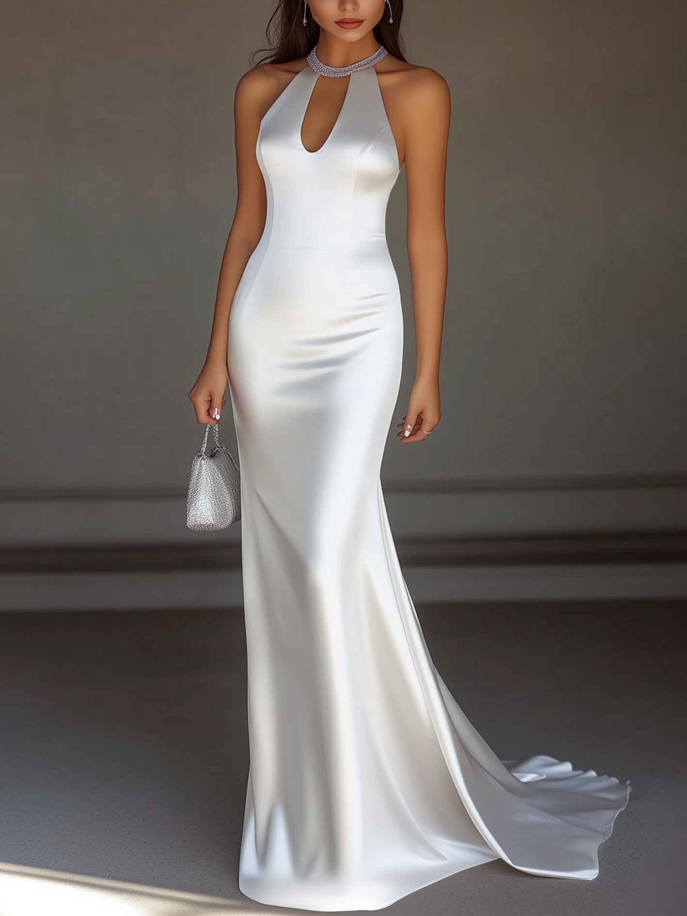 White Satin Halter Neckline Hollow Maxi Dress